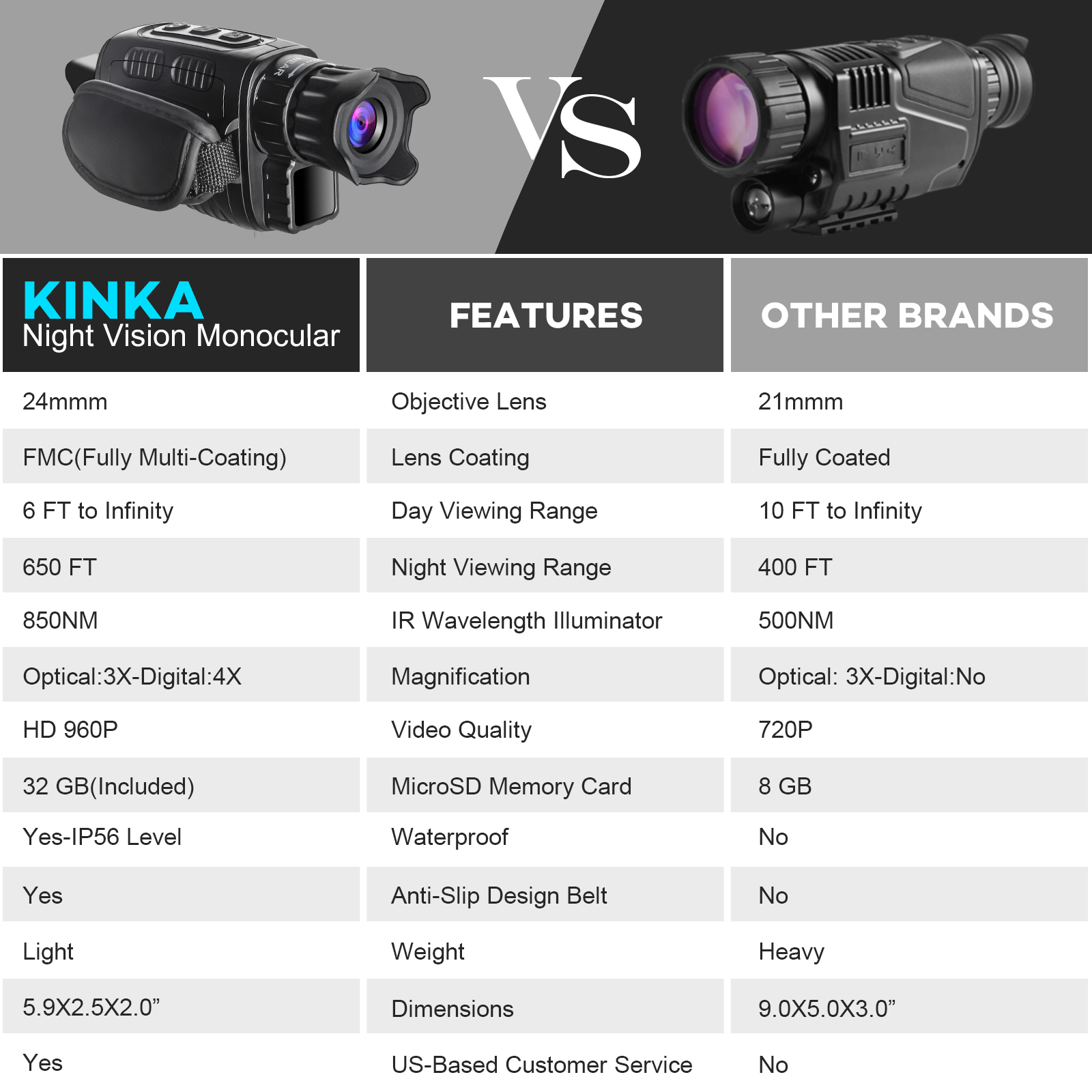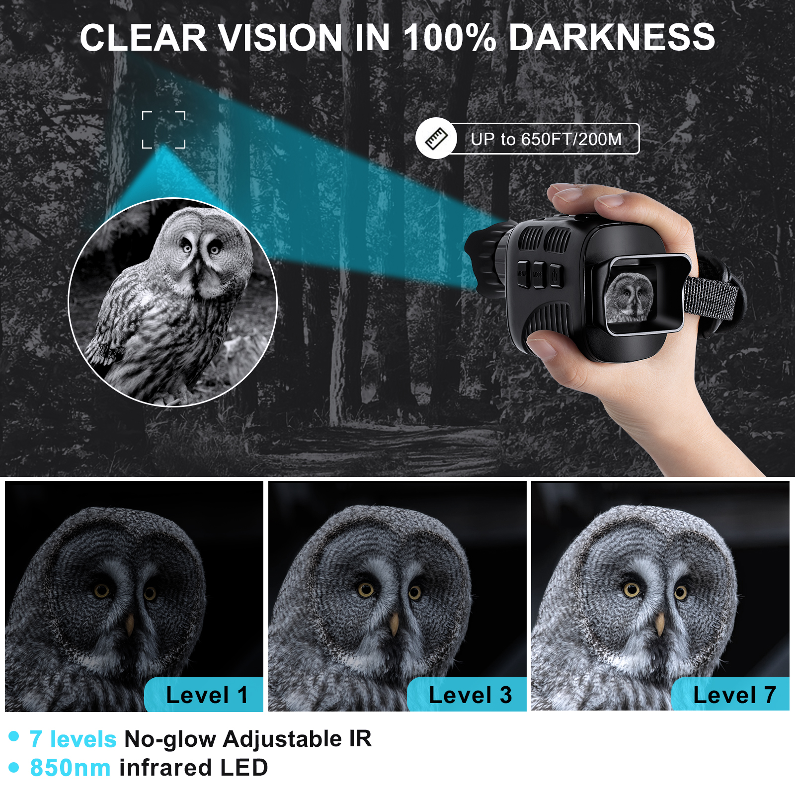 The night vision Monocular features a starlight-level sensor, a 24mm 10X magnification objective lens, 4X digital zoom and a 7 grades infrared adjustment. KINKA designed the most efficient digital night vision infrared monocular. The viewing distance is up to 650 ft/200m in 100% darkness. You can fully enjoy the wonderful moments even at night.